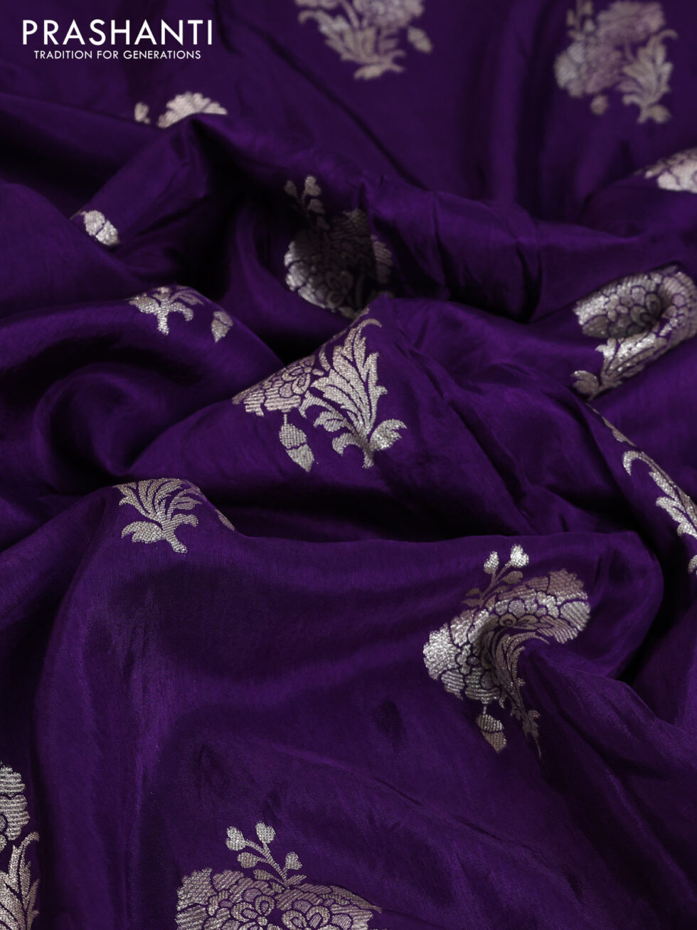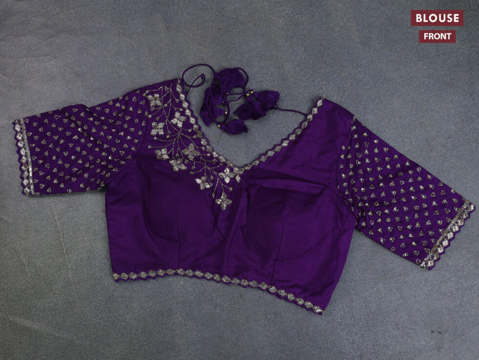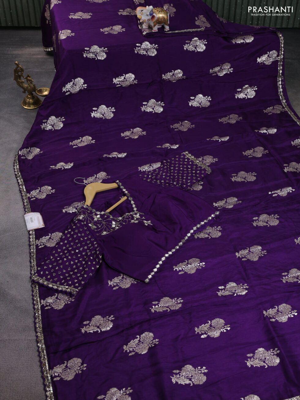 Banarasi silk saree violet with floral zari woven buttas and beaded work border