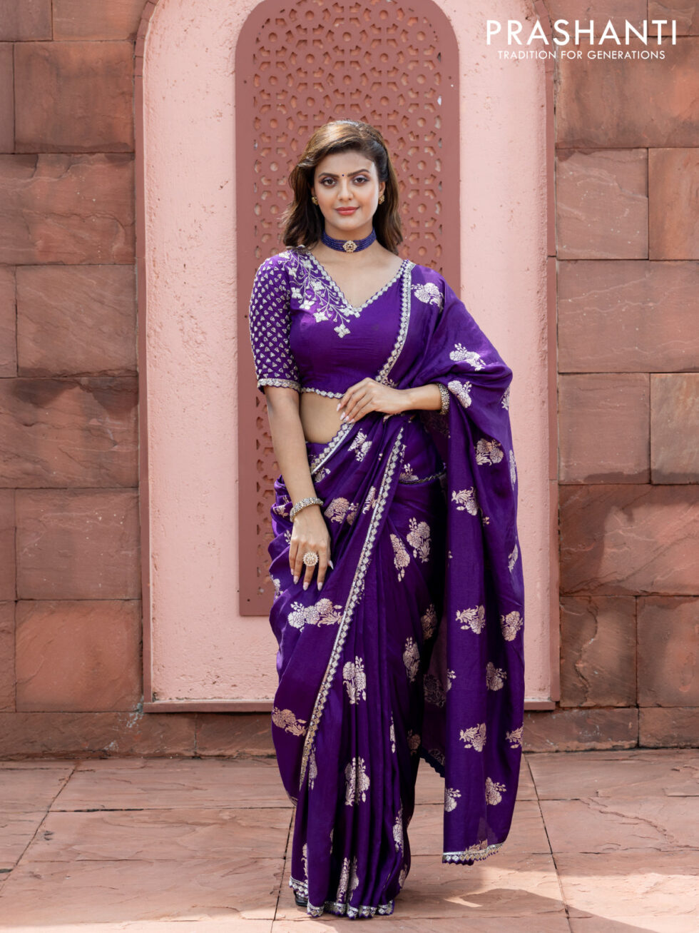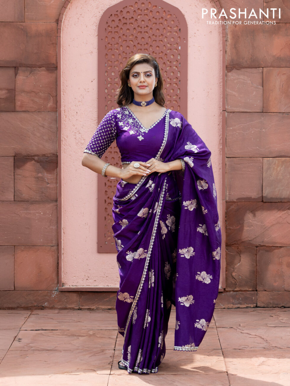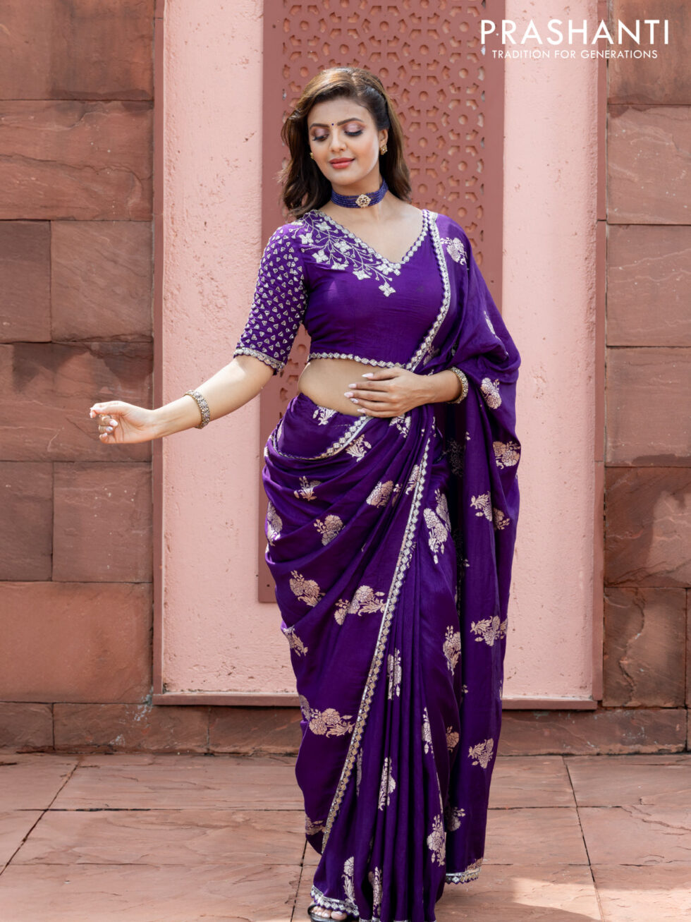 Banarasi silk saree violet with floral zari woven buttas and beaded work border